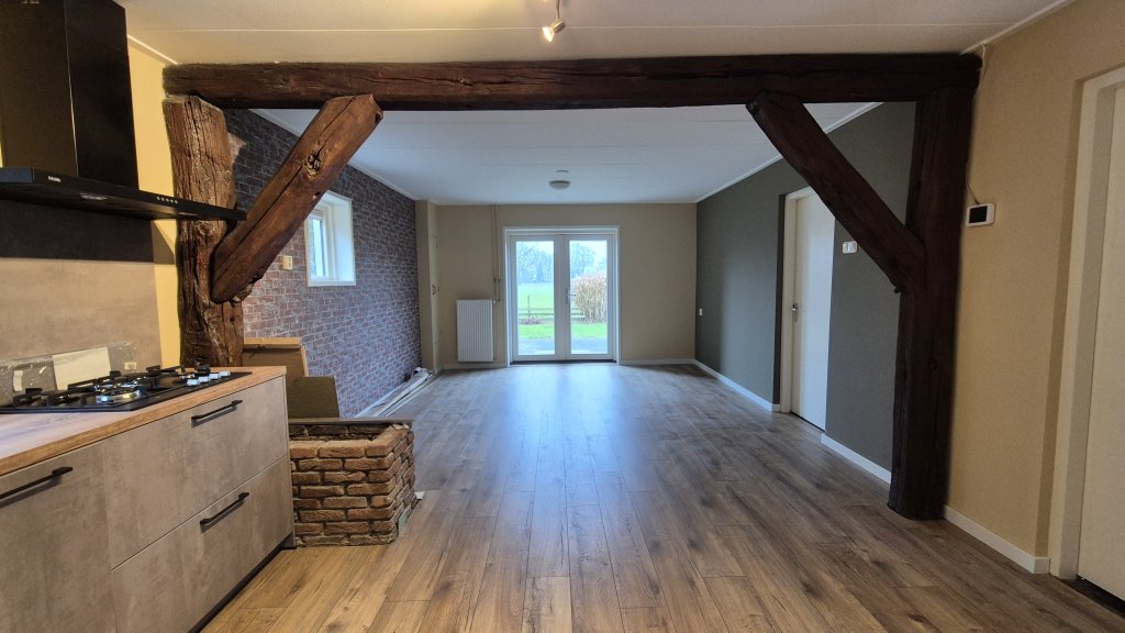 Via de entree komt u in de hal met toilet. De woning beschikt over een ruime slaapkamer van circa 13 m² en een bijzonder royale woonkamer met open keuken van ca. 40 m². De zichtbare houten balken geven de woonkamer een warm en karakteristiek gevoel. Grote raampartijen zorgen voor veel lichtinval en een prachtig uitzicht over het omliggende landschap.