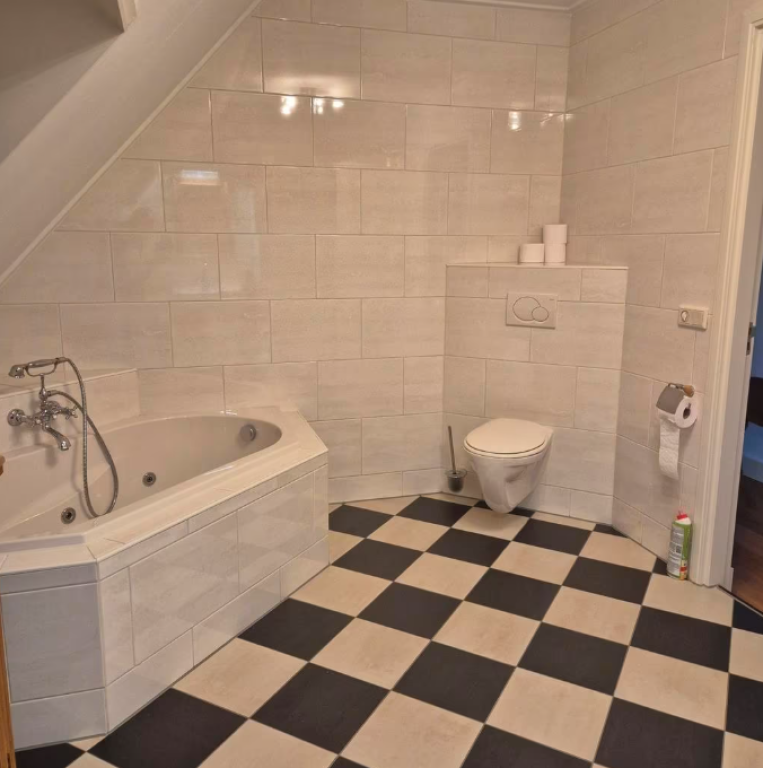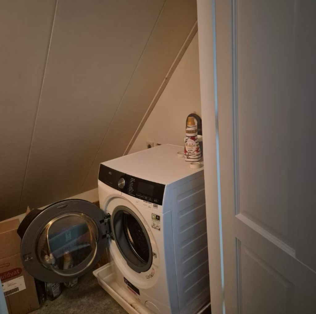 Overloop, 2 ruime slaapkamers, badkamer met inloopdouche, whirlpool en toilet, wasmachineruimte met wasmachine.