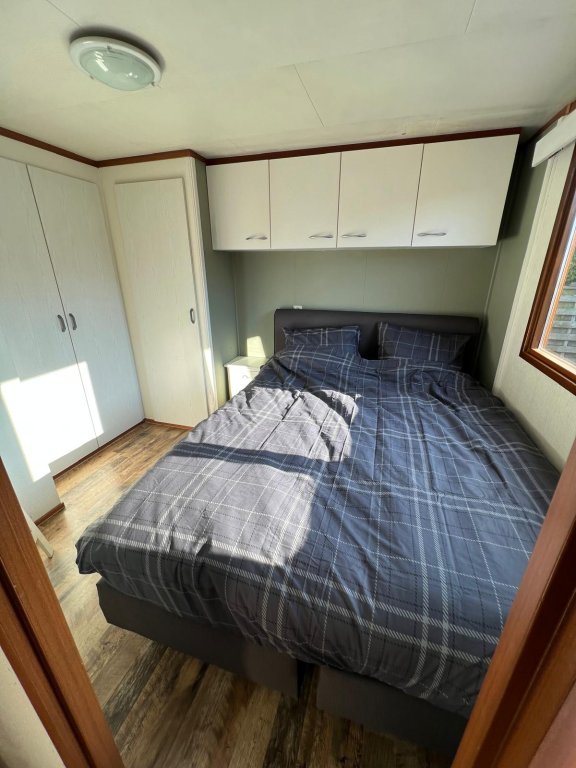 Slaapkamer met tweepersoonsbed en vaste kast met geiser, kastenwand, badkamer met douchecabine, wastafel, toilet.