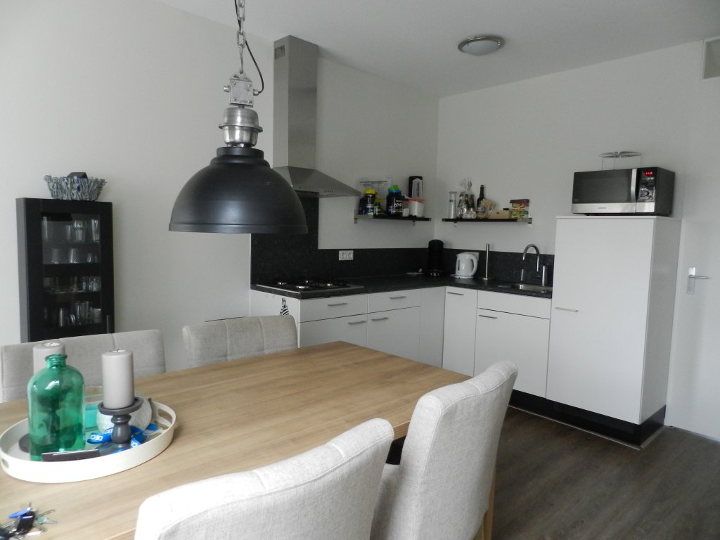 De lichte woonkamer (ca. 24 m²) beschikt over een open keuken. De keuken is voorzien van een gaskookplaat, RVS wasemkap en koelkast.